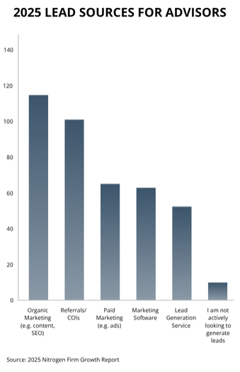 Organic marketing overtakes referrals for the first time, with 28% of advisors now citing content and SEO as their primary lead source versus 24.5% for referrals. Check out more insights on Basis Points: mbcstrategic.com/basis-points/
